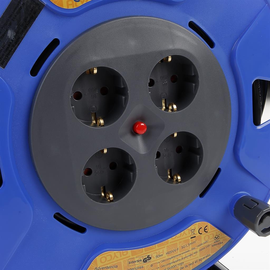 Enrollador de cable eléctrico con cable de 3 x 1 mm2, IP20 (protección 2 contra polvo y 0 contra agua), marcas CE y GS. Longitud de cable 5, 10 o 15 metros.